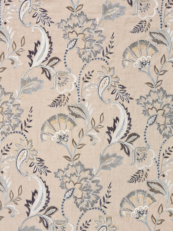 This graceful floral-and foliage embroidery is embellished with dimensional raised cording and subtle metallic silver yarns, adding a bit of glamour to its natural linen ground. The two soft colorations, in delft blues and neutral flax shades, are ideal for curtains and decorative applications.