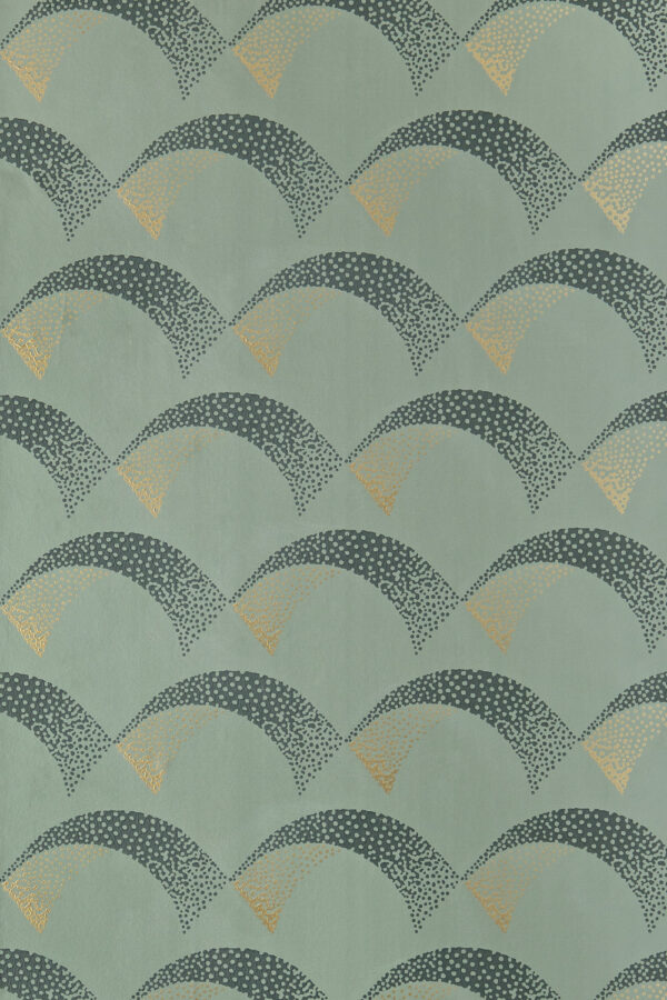 Inspired by the Art Deco movement which characterised design in the 1940s, Arcade is a soft, romantic take on the classic curved motif. The beautifully tactile scallop design gently dances across the length of the paper, creating an inherently sophisticated feel. Arcade 5307 in Green Smoke No.47, Studio Green No.93 and bespoke gold.Full roll width is 53cm/21″, roll length is 10m and pattern repeat is 21.7cm.
