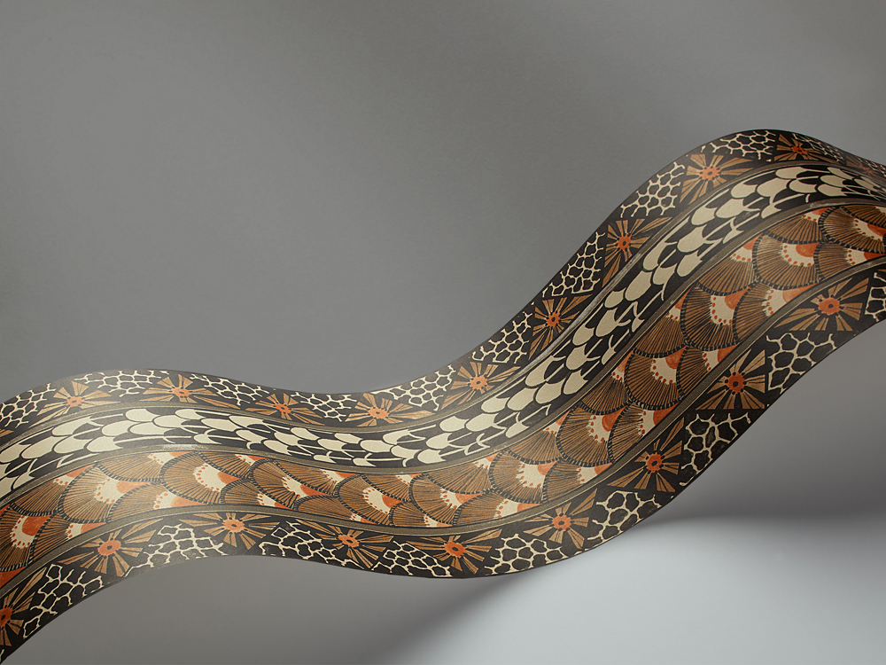 Taken from the decorative detailing on a ceramic vase, this pretty decorative border acts as a decorative edging to many of the papers contained within this collection. Designed to be hung both vertically and horizontally it is offered in three colourings of black and white, soft olive, and a dramatic burnt orange and charcoal.