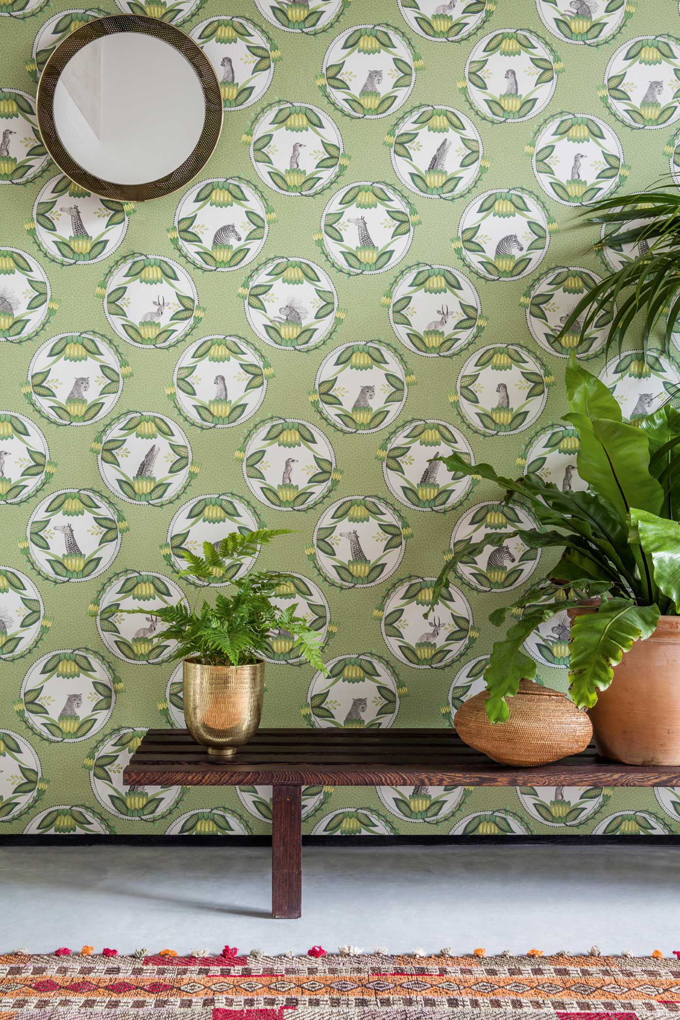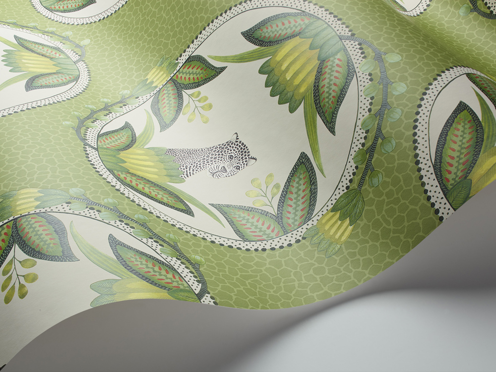 The Ardmore Cameos wallpaper is a very personal representation of a series of plates that were created originally as a wedding gift to a ‘friend of Ardmore’. With each animal portrait, including a rather haughty zebra and a quizzical leopard, set against a backdrop of softly drawn giraffe spots, this delightful cartouche wallpaper is offered in four colourings of soft olive, grey, pale khaki, and a striking black and white, and is printed with a striking 68.5cm wide repeat.
