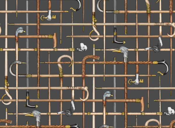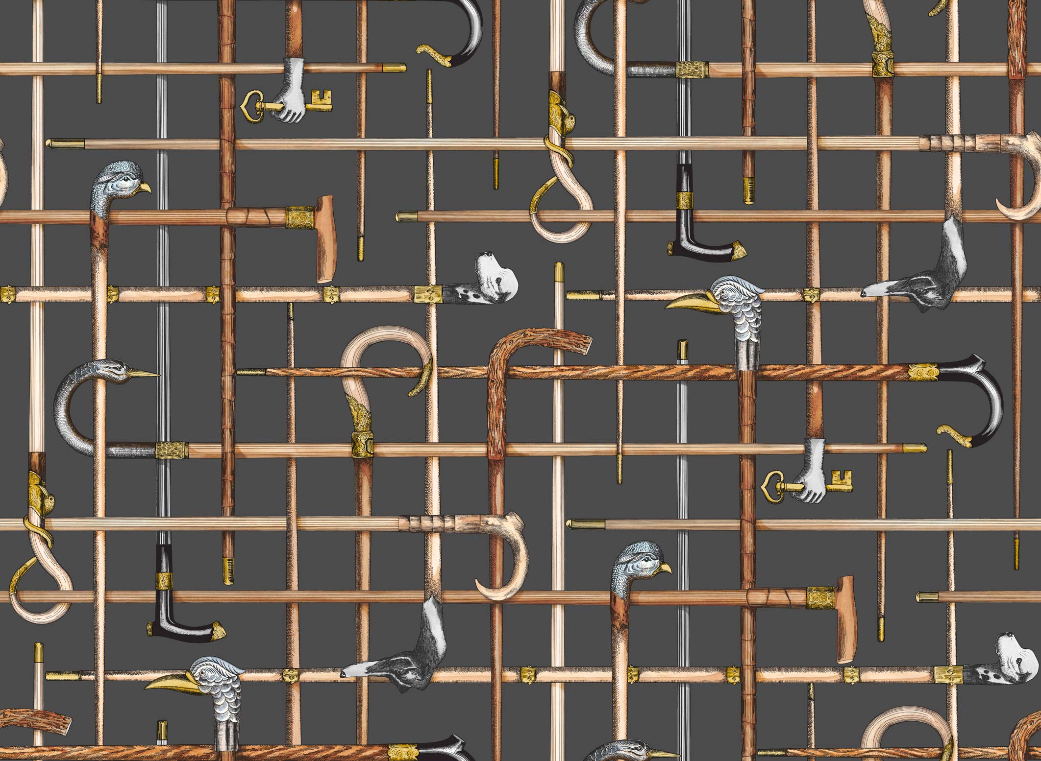 Originating as a silk scarf print from the 1940s, the ‘canes’ of Bastoni reflect the eclectic nature of the house of Fornasetti, brimming with umbrella and hat stands full of antique walking canes. The graphic checkerboard style of the repeat is reminiscent of many Fornasetti favourites, resulting in a striking and bold motif. Bastoni is printed with a gravure four-colour process, to ensure all details remain sharp, with flecks of tonal metallic detail added in a luxurious gold. Choose from three classic colourways of Cream, Racing Car Green, and Charcoal.