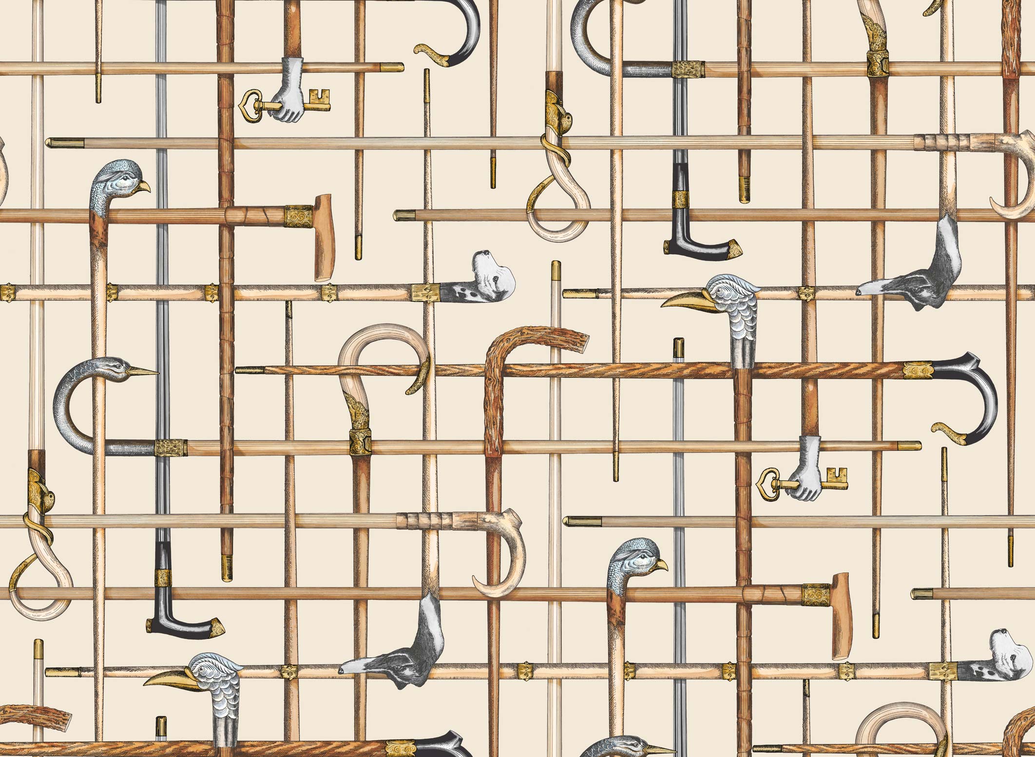 Originating as a silk scarf print from the 1940s, the ‘canes’ of Bastoni reflect the eclectic nature of the house of Fornasetti, brimming with umbrella and hat stands full of antique walking canes. The graphic checkerboard style of the repeat is reminiscent of many Fornasetti favourites, resulting in a striking and bold motif. Bastoni is printed with a gravure four-colour process, to ensure all details remain sharp, with flecks of tonal metallic detail added in a luxurious gold. Choose from three classic colourways of Cream, Racing Car Green, and Charcoal.