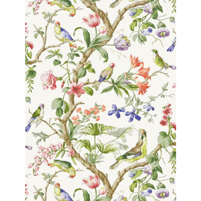 This pretty tropical print features a branching tree that is accented with foliage, flowers and exotic birds. The finely drawn detail of the design is interpreted in a profusion of color, adding to its botanical look. This coordinating wallpaper matches the cotton print of the same name, and is now printed on 54” nonwoven paper, giving the pattern a crisp, detailed look and paste-the-wall installation.