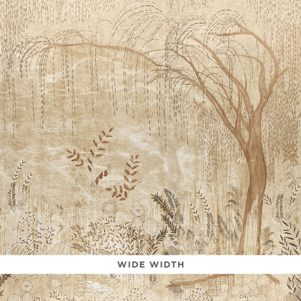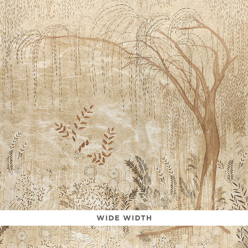 Digitally printing California-based muralist Colette Cosentino’s gauzy weeping willow painting on a pearlized ground imparts a subtle shimmer to the subdued haziness of the landscape. Available in three non-repeating panels.