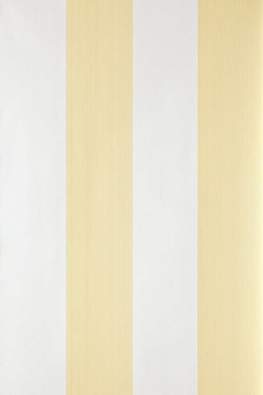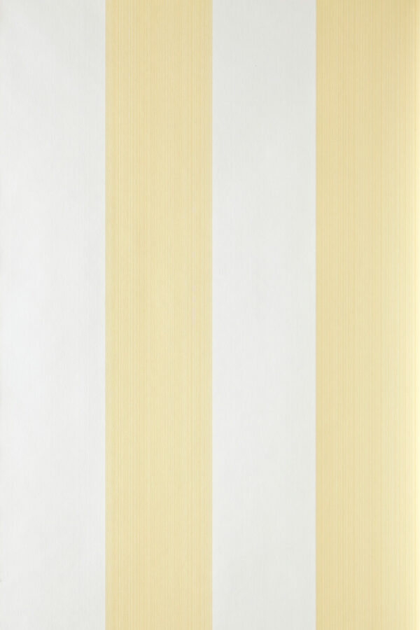 The 5¼˝ Broad Stripe is created using a traditional dragging technique. The coloured ground is traditionally trough and brush applied and the stripe made by pulling the paper under open bottomed, 5¼˝ wide troughs filled with paint. Broad Stripe 1319 in All White No.2005 and Dayroom Yellow No.233.Full roll width is 53cm/21″, roll length is 10m, stripe size is 13cm/5 1/4″. A
