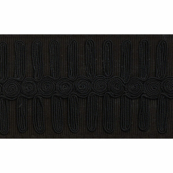 Heavily embroidered on a handsome, ribbed cotton ground, this tape has a graphic and dramatic flair that feels both structured and relaxed.