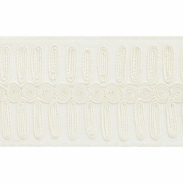 Heavily embroidered on a handsome, ribbed cotton ground, this tape has a graphic and dramatic flair that feels both structured and relaxed.