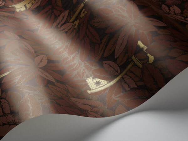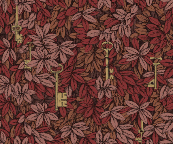The much-loved Chiavi Segrete combines two influential Fornasetti motifs: mystical, dense leaves concealing golden, antique keys. This fanciful design has a magical quality, drawing the eye through and around the leaves to discover each of the ‘secret keys’ hidden within. Warm gold and sage tones comprise the subtly lustred Gilver and Gold, whilst Olive creates a soft, true-to-life tone of spring undergrowth, with a seasonal twist in Autumnal Leaves’ deep rouge red and bronze hues.