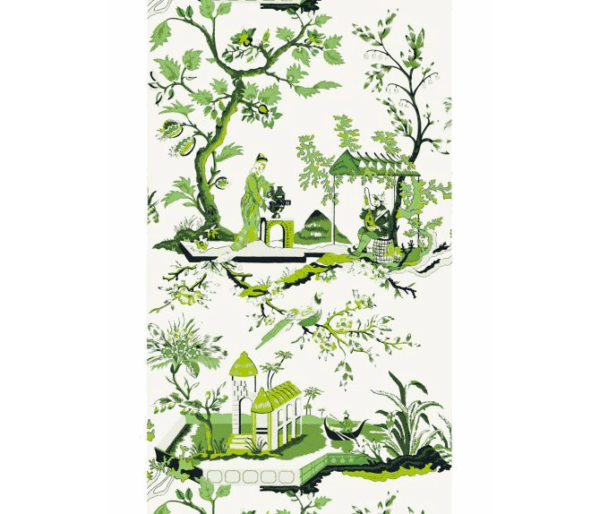 This chic chinoiserie hand printed wallpaper was first introduced into Scalamandré’s collection in 1990. Weve used the original screens and given it an update with fresh new colorations against crisp white grounds. The charming scenic design is adapted from antique Chinese hand painted scenic wall panels, reinterpreted in a simple and graphic style.