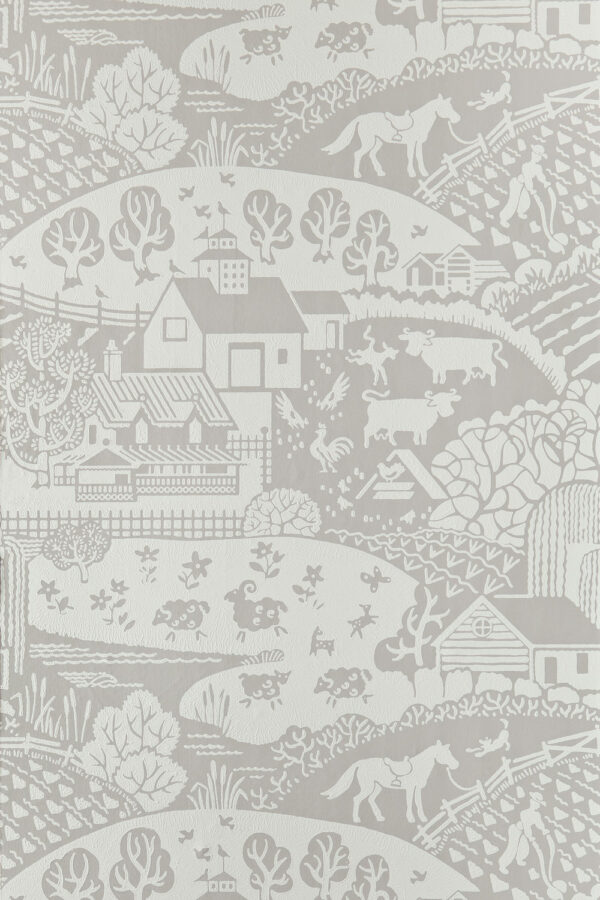 Depicting a charming rural scene of ploughed fields, picket fences and farmyard animals, Gable perfectly captures the youthful innocence of simpler times. The intricate mural design is imbued with playful details that capture the imagination. Gable 5401 in Purbeck Stone No.275 and Strong White No.2001.Full roll width is 53cm/21″, roll length is 10m and pattern repeat is 56 cm.