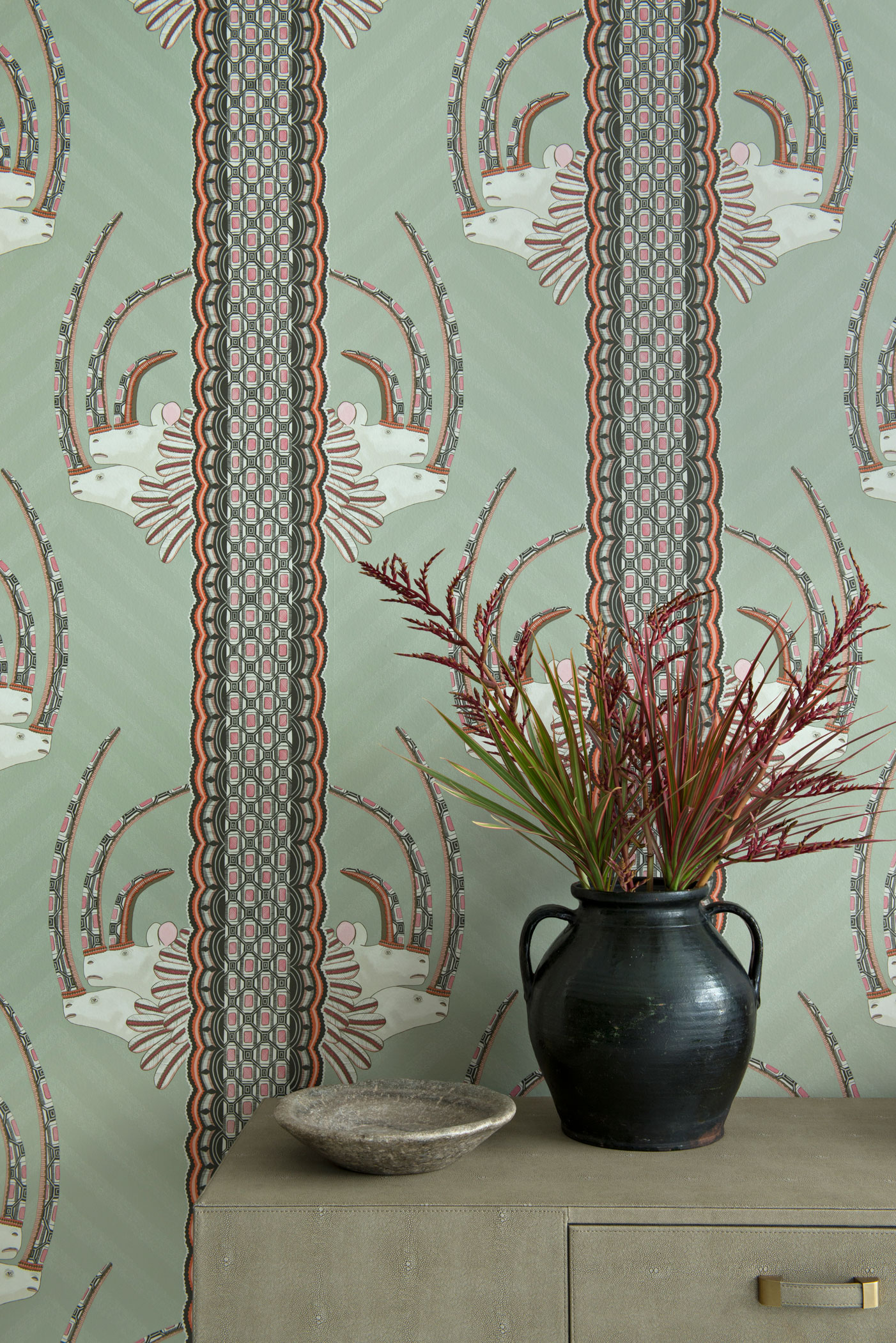 Named after one of Ardmore’s finest designers, Jabu Nene, this design takes its inspiration from the wonderfully sculptural rhino hand-coiled vessels, created by sculptor Somandla Ntshanlintshali. These pots are then intricately painted in eye-dazzling colours and patterns by Jabu Nene herself and now form a part of Ardmore’s most well-loved signature styles. Our Cole and Son artists have used the markings on these pots to create a wonderfully rich and vibrant vertical stripe, out of which peek a pair of regal white rhinos complete with adorned horns and feathered ruffs. This wallpaper contains a true African spirit with its patterning reminiscent of Zulu basket weaving and is presented in five striking colourings, including sharp black, white, and grey neutral tones alongside earthy olives, tobaccos, and a tribal navy blue and orange.