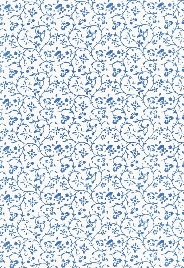 This hand block print of meandering flowered vines of flowers features graceful branches dotted with simply drawn blossoms and foliage, which gives it a charming and rustic look.