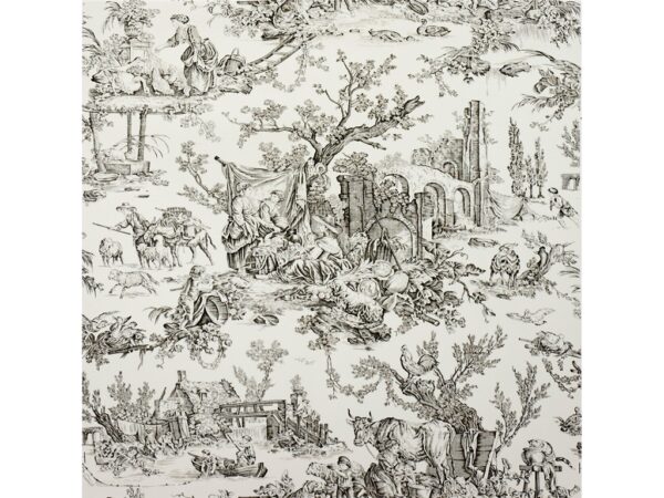 Toile print on 100% paper. Color: Black/White, Full roll width is 34.5″, Vert. repeat 34.5″, Horz. repeat 34.5″, roll length is 4 yards sold by 8 yard double rolls. 2 roll minimum.