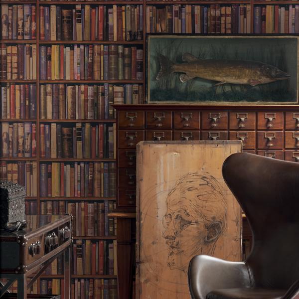 A clever bookcase design with painterly book spine detailing in realistic Multi. Our Library wallpaper, central to the theme of the Navigator Collection which reimagines the nostalgia of English aristocracy, consists of two separate rolls that can be pasted alternately to provide more variety to the design.