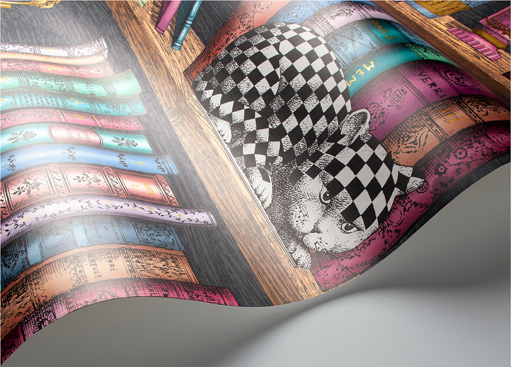 Libreria expands upon one of the most iconic Fornasetti motifs of leather-bound tomes with the addition of the collector’s ‘library’ of Objets d’art and glassware adorning its shelves. The jewel-like Rich Multi palette of emerald, sapphire and ruby creates a dazzling feast for the eyes, with subtle metallic gold highlights on book spines, glassware detailing, and each golden ornament for a rich and decadent wallcovering.
