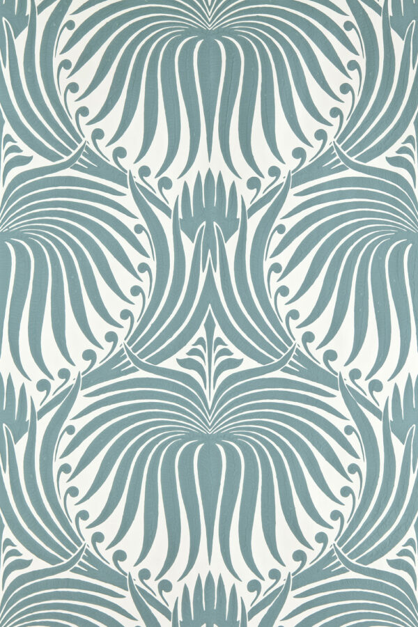 The Lotus Papers are an artisanal lotus-flower design, which is drawn from 19th century French archives and influenced by the Arts & Crafts Movement. Lotus 2053 in Pointing No.2003 and Oval Room Blue No.85.Full roll width is 53cm/21″, roll length is 10m, large pattern repeat is 51.8cm or 20 3/8″. Available in 14 colourways.