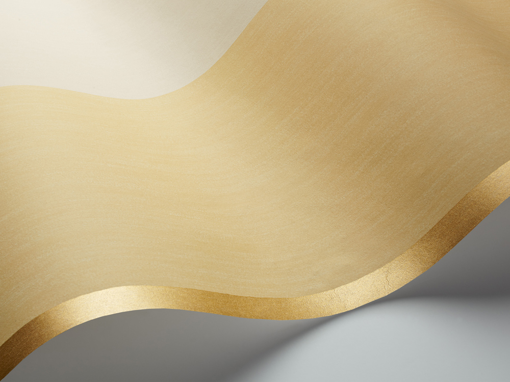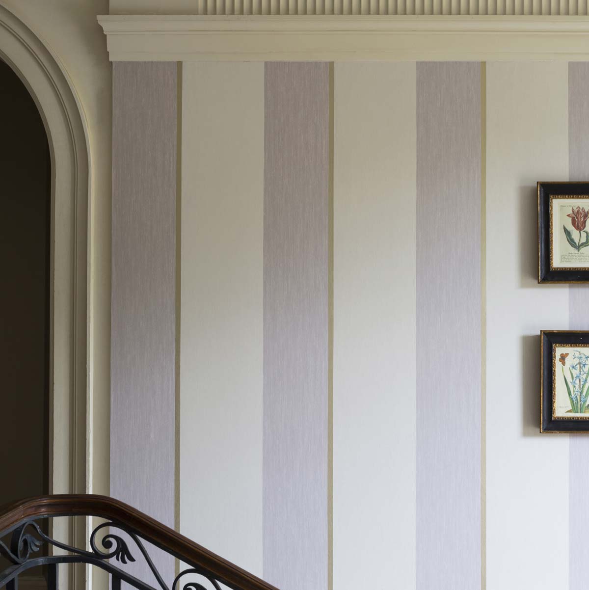 Named after the small royal residence of Louis XIV, the Marly wallpaper features an elegant wide painterly stripe of chalky hues of lavender, duck egg, yellow and pale blue decorated with thin ribbons of metallic gold, silver, and bronze.