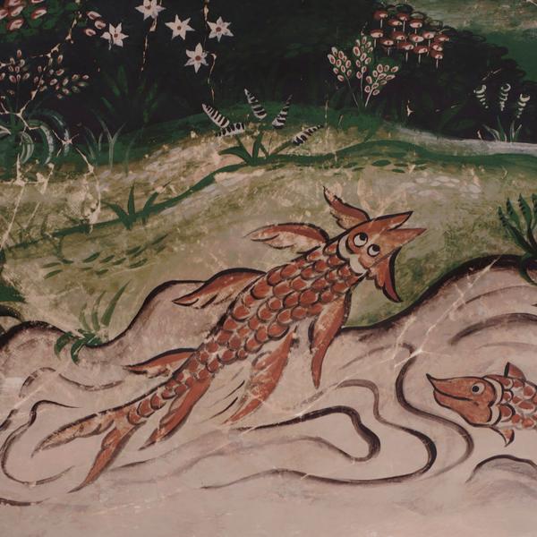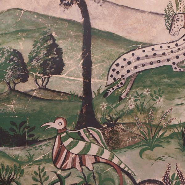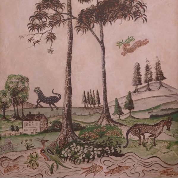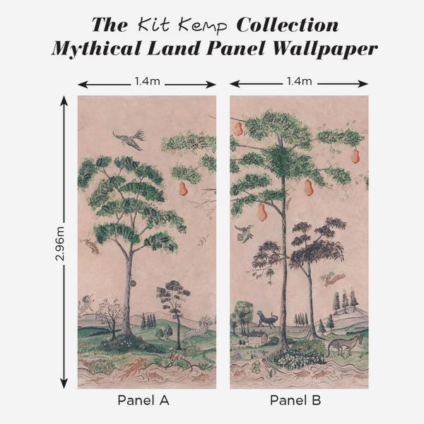 Inspired by American folk art, this giant 3 metre repeat wallpaper will whisk you away to tales of old unleashing childlike enthusiasm for fairy tales. Mythical Land tells an enchanting story. Walk through a magical world on your walls, from a lively river bordered with wild flowers to a tree growing giant pears and a whole dance of mythical creatures along the way.