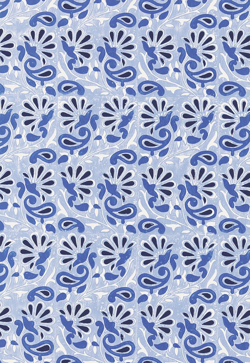 This multicolored hand block printed wallcovering features an undulating vine of stylized flowers and swirling paisley motifs. The background of this design is also block printed, creating a textured, painterly surface in which each block repeat may be clearly seen. The palette ranges from quiet Oyster, which blends ivory, sand and pale grey shades, to brilliant Turquoise, which is accented with navy blue and metallic gold.