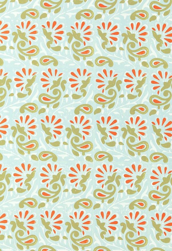 This multicolored hand block printed wallcovering features an undulating vine of stylized flowers and swirling paisley motifs. The background of this design is also block printed, creating a textured, painterly surface in which each block repeat may be clearly seen.