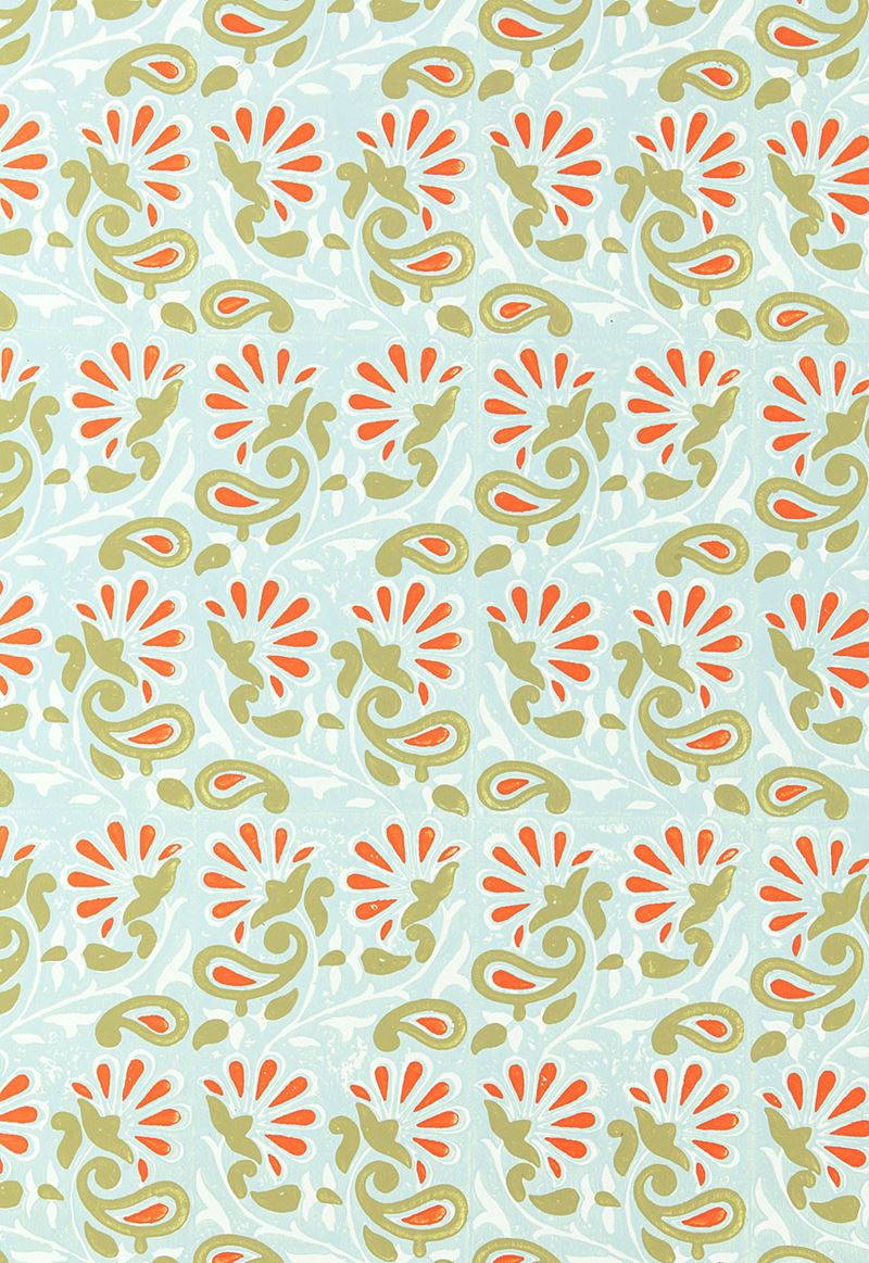 This multicolored hand block printed wallcovering features an undulating vine of stylized flowers and swirling paisley motifs. The background of this design is also block printed, creating a textured, painterly surface in which each block repeat may be clearly seen. The palette ranges from quiet Oyster, which blends ivory, sand and pale grey shades, to brilliant Turquoise, which is accented with navy blue and metallic gold.