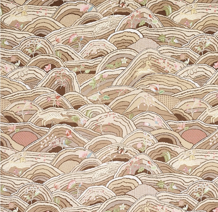 Charming animals gambol within a naïve landscape in this whimsical full-coverage print. This design preserves the rustic simplicity of the embroidered original, which dates to 1960.