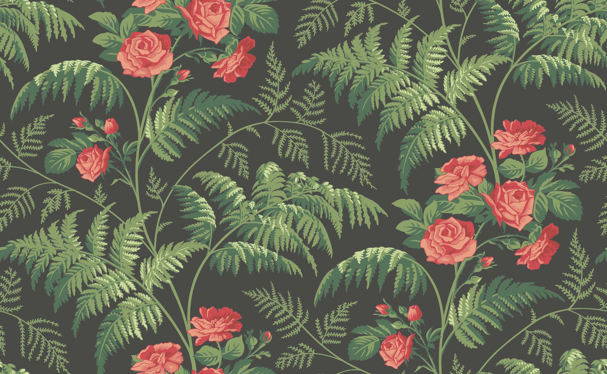 A staple of the English country garden, the blousy Rose is loved as much for its redolent fragrance as its radiant foliage. This charming ogee trail design with lush, budding bouquets is surrounded by fern fronds, creating a richly organic, delicately detailed motif. This quintessentially English pairing has been reimagined in unexpected, contemporary palettes of vivid Cerise & Burnt Orange and deep Black, and cool White & Ice Blue on Denim, as well as a classically toned Red & Leaf Green on smoky Charcoal.