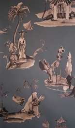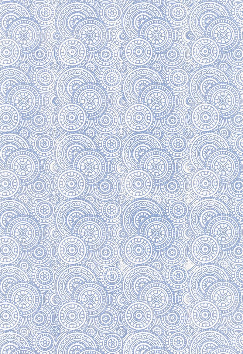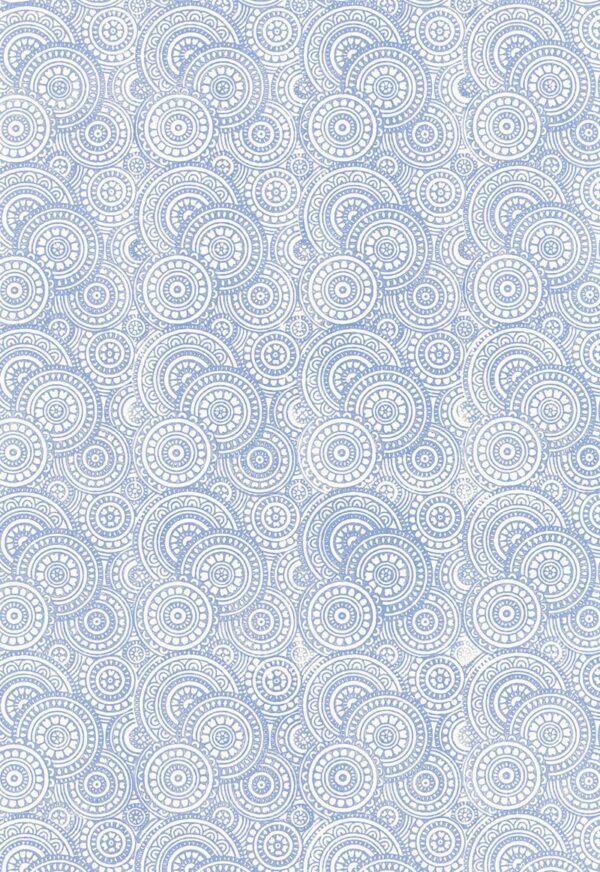 Decoratively detailed circles overlap each other in this hand block printed wallcovering. Its filigree detail forms a continuous pattern across a solid ground, printed with subtle texture in a softened palette of neutrals, pale blue and antique metallic gold. Priced by the single roll, 4.5 yards/roll. Packaged and sold by the double roll. Match – Straight Width – 27″ Horizontal Repeat – 6.75″ Vertical Repeat – 6.75″ Country of Finish – India Untrimmed