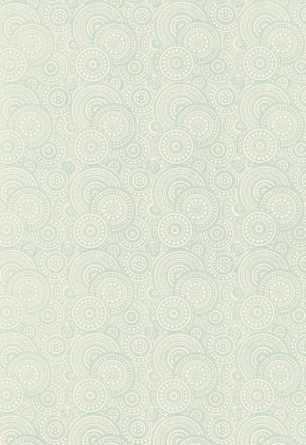 Decoratively detailed circles overlap each other in this hand block printed wallcovering. Its filigree detail forms a continuous pattern across a solid ground, printed with subtle texture in a softened palette of neutrals, pale blue and antique metallic gold. Priced by the single roll, 4.5 yards/roll. Packaged and sold by the double roll. Match – Straight Width – 27″ Horizontal Repeat – 6.75″ Vertical Repeat – 6.75″ Country of Finish – India Untrimmed