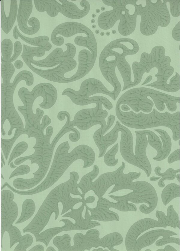 An early 19th-century English damask paper originally printed at Silvergate in Norfolk. Full roll width is 53cm/21″, roll length is 10m/11yds, pattern repeat is 131cm/51 1/2″.