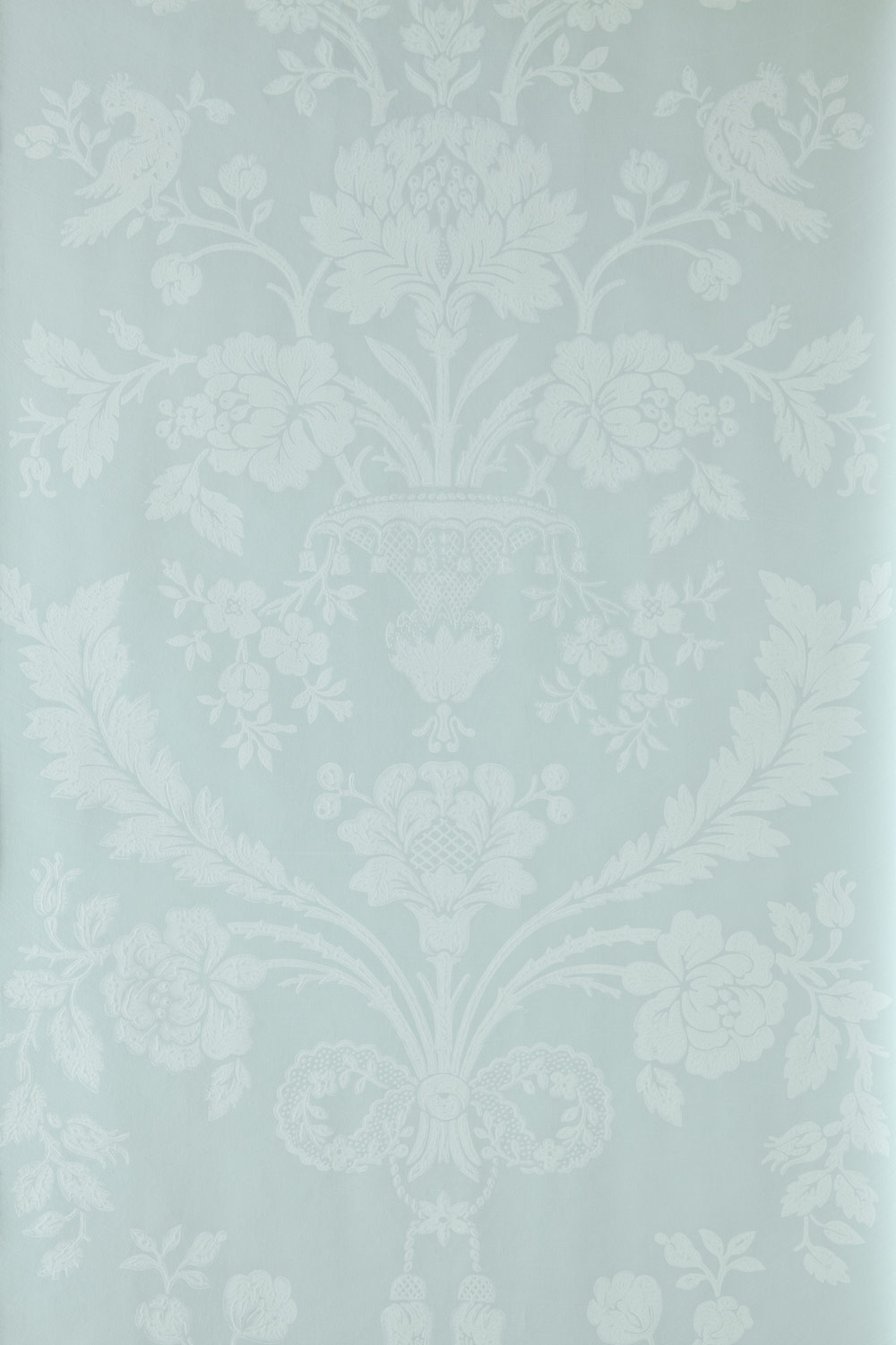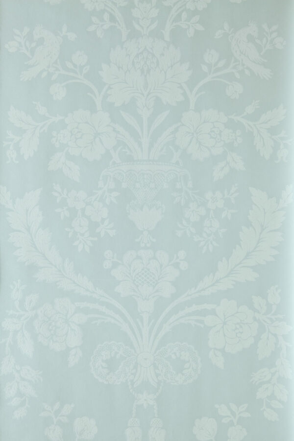 An 18th century French damask paper originally produced in 1793 at St Antoine. St Antoine 945 in Teresa’s Green No.236 and bespoke blue. Full roll width is 53cm/21″, roll length is 10m, pattern repeat is 85cm/33 12″. Available in 12 colourways.
