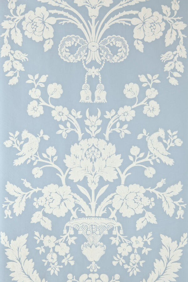 An 18th century French damask paper originally produced in 1793 at St Antoine. St Antoine 946 in Parma Gray No.27 and Pointing No.2003.Full roll width is 53cm/21″, roll length is 10m, pattern repeat is 85cm/33 12″. Available in 12 colourways.