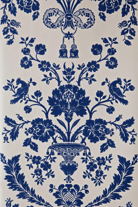 An 18th-century French damask paper originally produced in 1793 at St Antoine. Full roll width is 53cm/21″, roll length is 10m/11yds, pattern repeat is 85cm/33 12″.