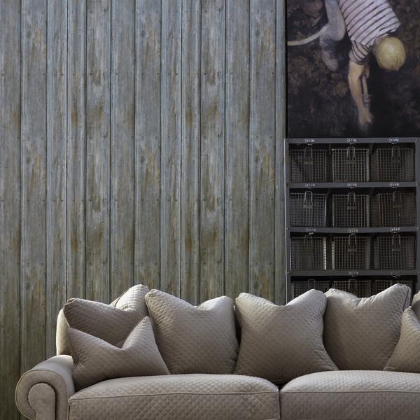 A distressed wood panelling wallpaper design. Part of the Engineer Collection, inspired by film sets, find Timber in 4 different wood colourways.