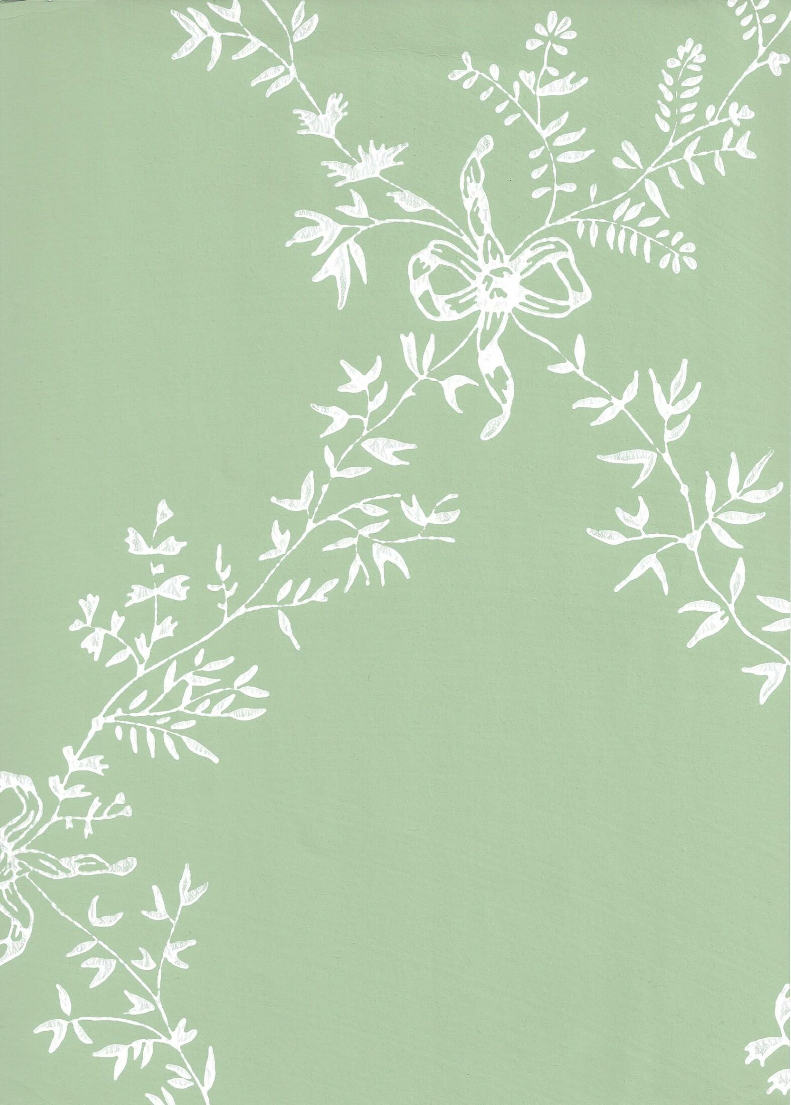 Toile Trellis is based on an original 18th-century fabric design. This is a quietly nostalgic wallpaper, featuring delicate leaf motifs and romantic bows that create a warm, idyllic feel. Full roll width is 53cm/21″, roll length is 10m/11yds, pattern repeat is 62cm/24 1/3″.
