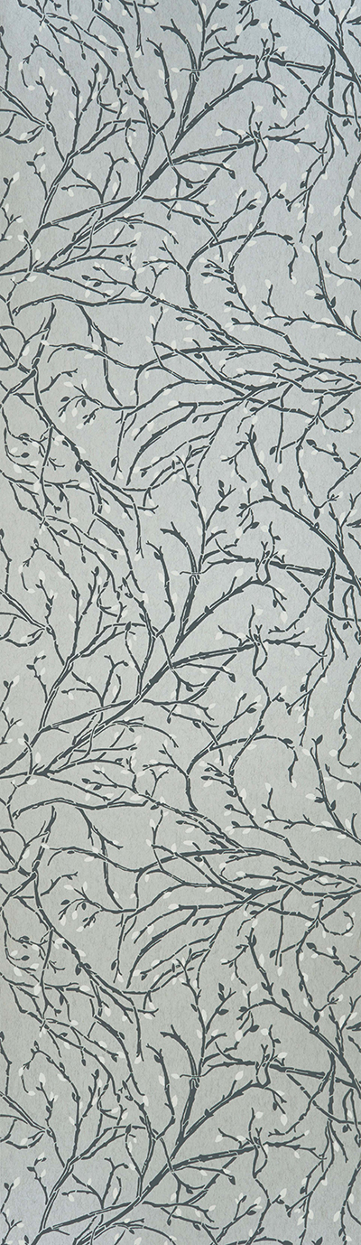 An all-over pattern of painterly twigs with buds picked out with metallic or contrasting colour detail.