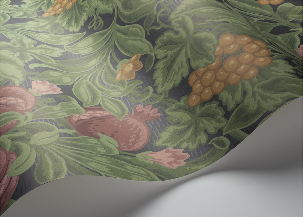 An ode to the Roman goddess of the harvest and fruitful abundance, Pomona, this Arts and Crafts style design is a bountiful cornucopia of fruits and orchard vines. This celebration of nature and traditional craftsmanship is presented in classically botanical palettes of Ochre & Olive Green on Cream; and Crimson & Olive on Charcoal, alongside contemporary shades of Burnt Orange & Teal on Petrol; and Teal & Viridian on Denim.